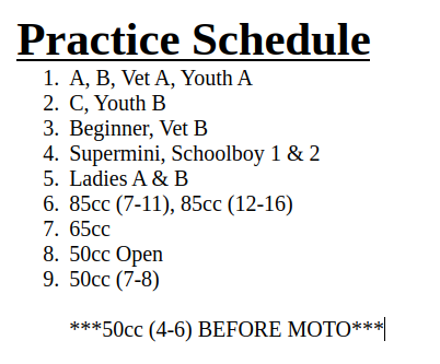 Moto 1: After Last Practice (Estimated 9:10am)